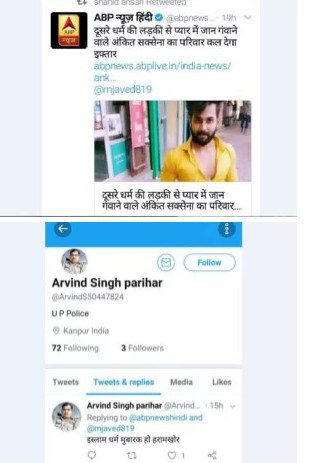 दरअसल दिल्ली में रहने वाले अंकित सक्सेना की हत्या प्रेमिका के रिश्तेदारों ने की थी, अंकित का दूसरे समुदाय की लड़की से अफेयर था. अंकित सक्सेना हत्या के मामले में ट्वीटर पर पोस्ट पर सिपाही ने जाती विशेष पर अभद्र कमेंट्स किये थे. सिपाही अरविन्द सिंह परिहार के कमेंट्स पर शहीद अंसारी ने रिप्लाई किया तो उनको भी अरविन्द सिंह अभद्र कमेंट्स किए.