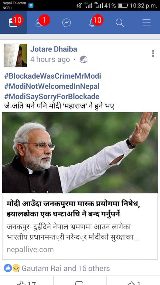 भारत के प्रधानमंत्री नरेंद्र मोदी आज दो दिन की नेपाल की ”धार्मिक-सांस्कृतिक” यात्रा पर जनकपुर पहुंचे लेकिन सोशल मीडिया समेत कई डिजिटल मंचों पर दो साल पहले हुई आर्थिक नाकेबंदी से पैदा हुए गुस्से ने उनका स्वागत किया।